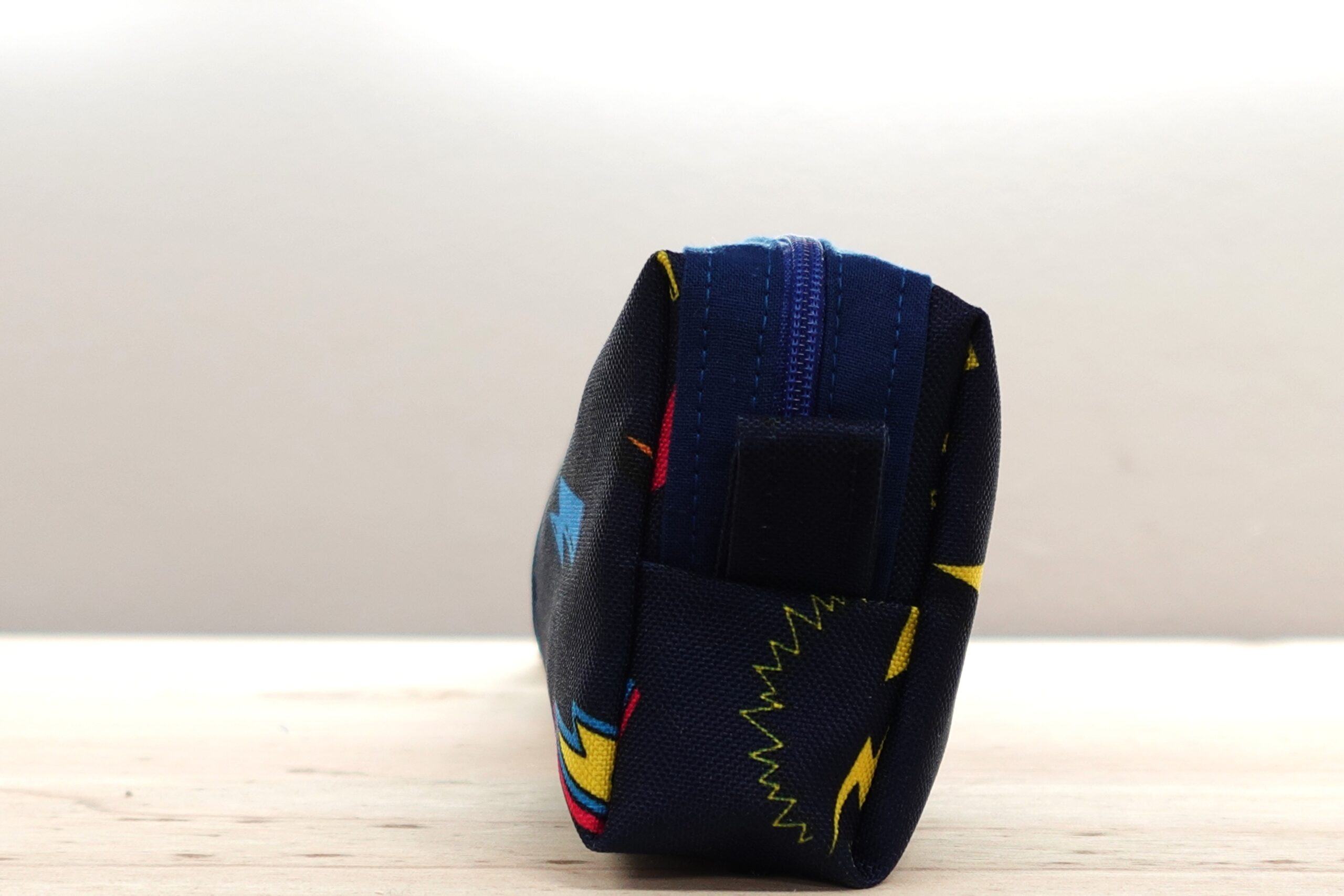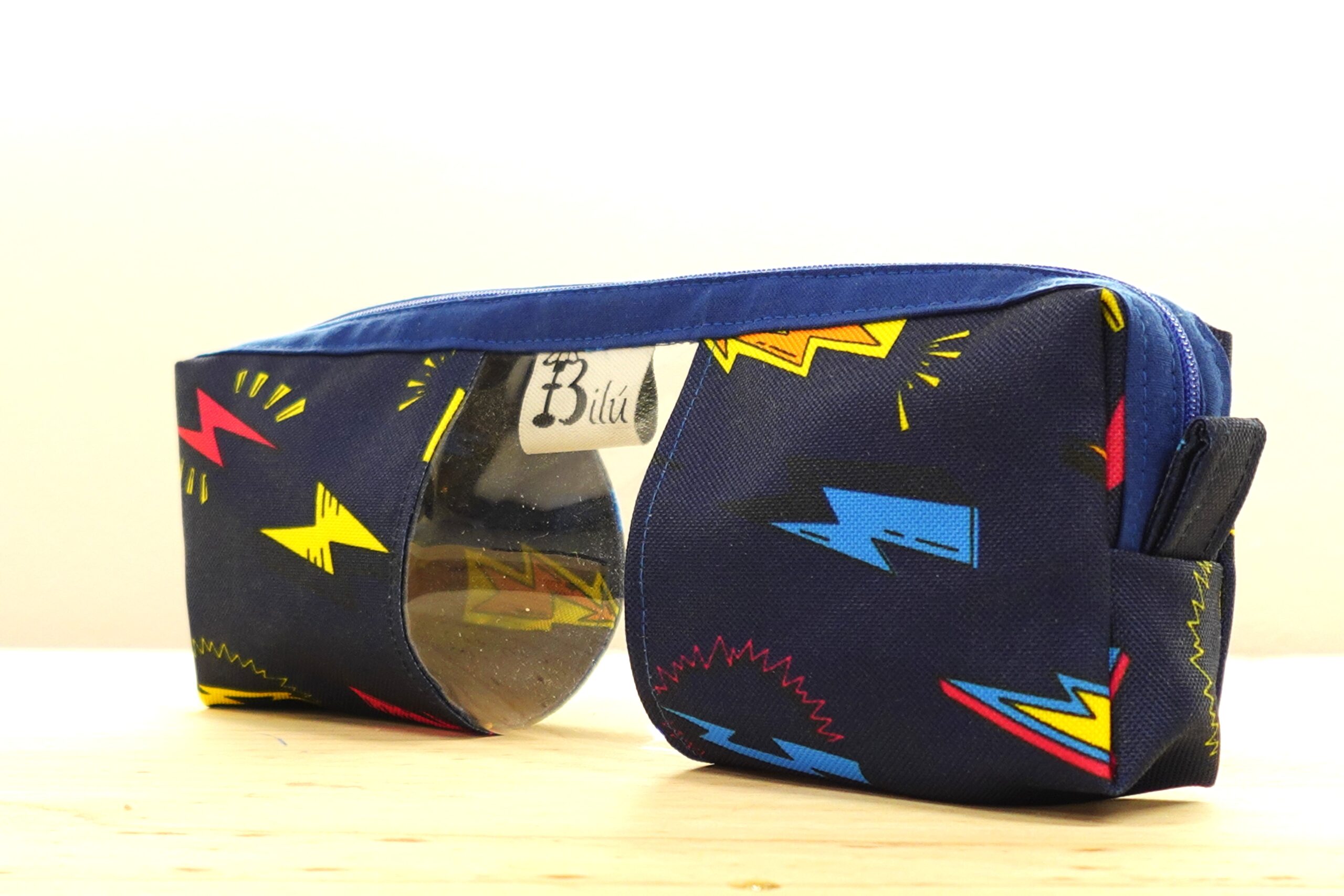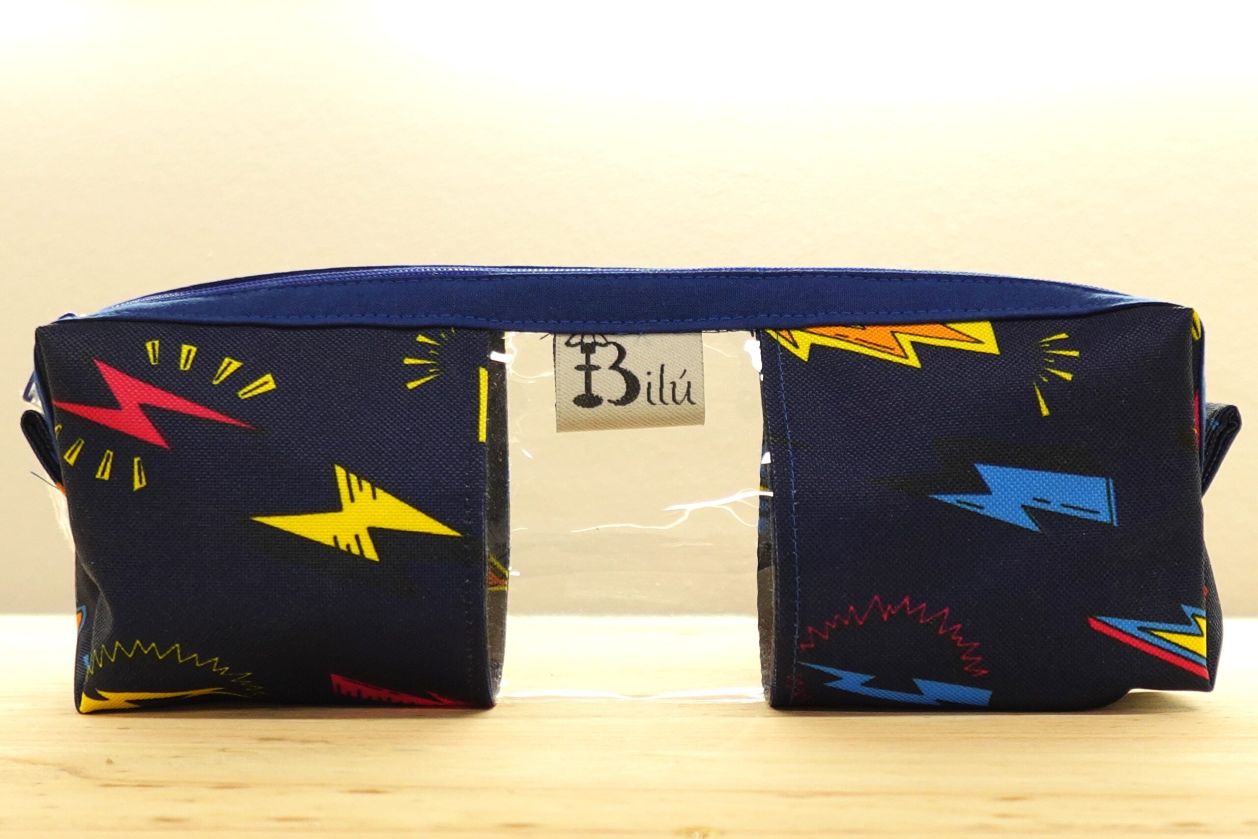 Estuche hecho en tela de loneta resinada con motivos de rayos de colores. Tiene una franja de plástico para ver lo que contiene. Con cremallera.