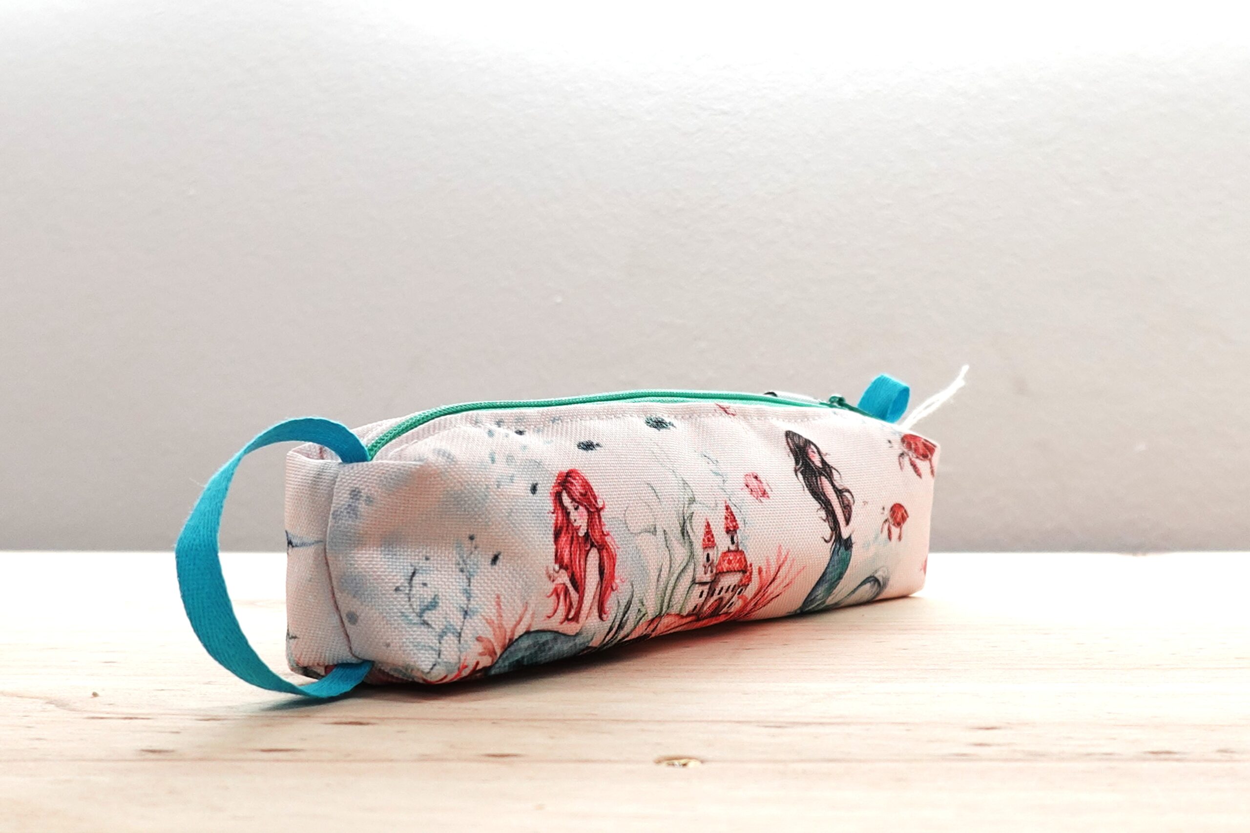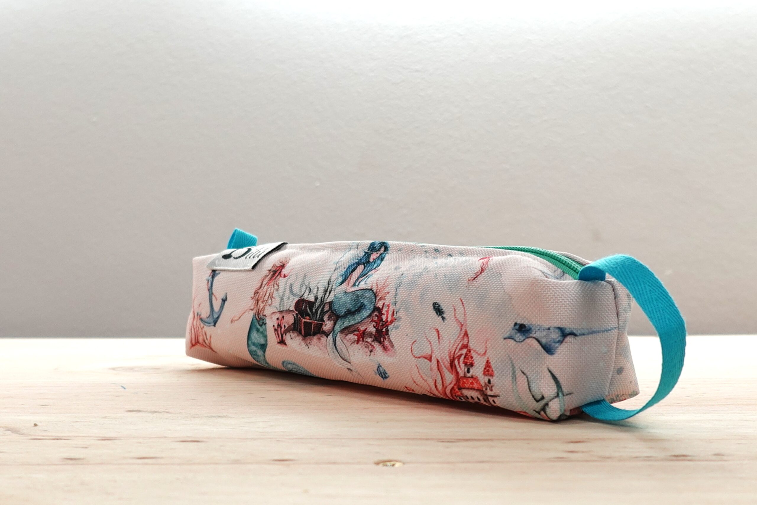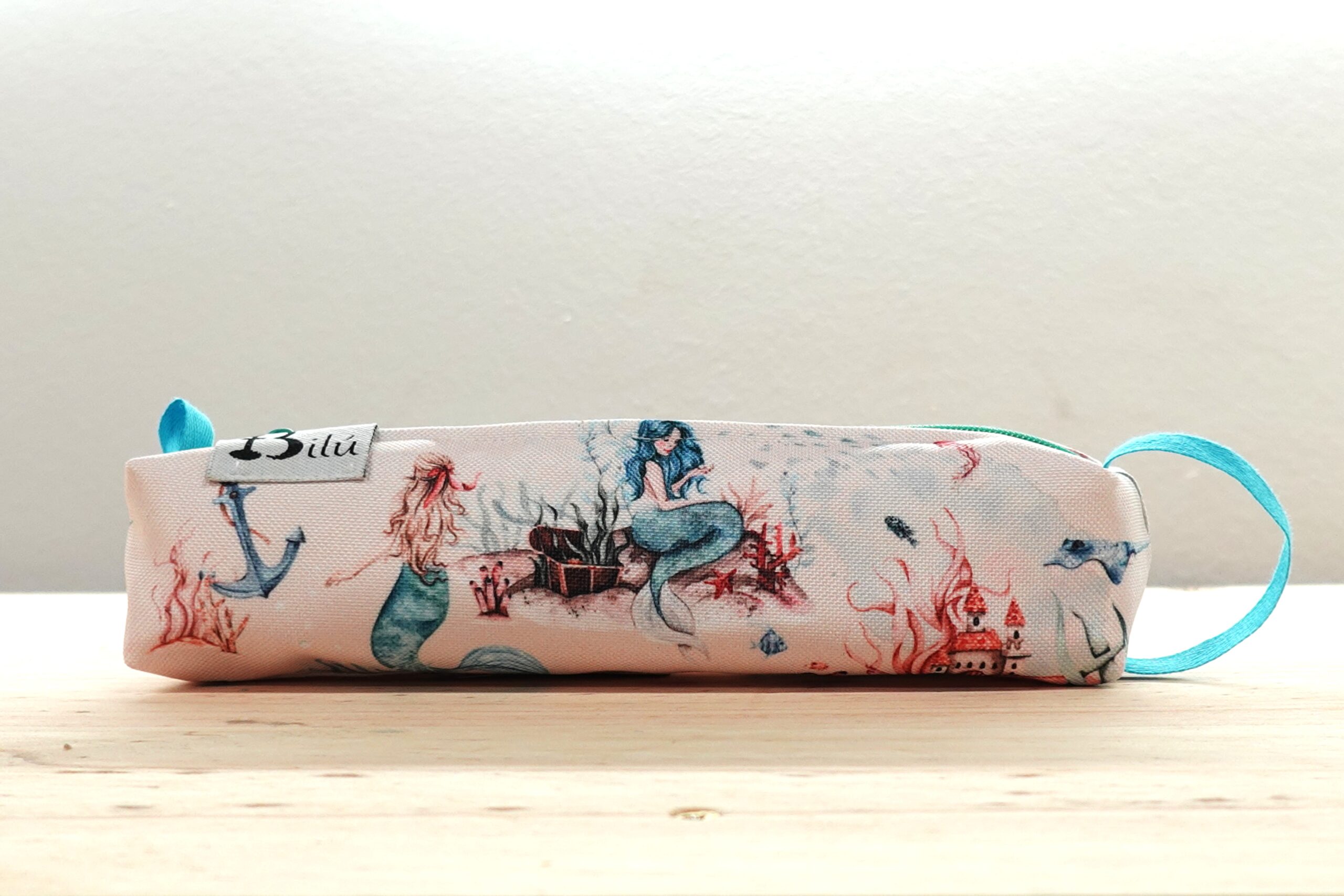 Estuche pequeño hecho en tela de loneta resinada con motivos de sirenas en azul. Con cremallera. Forro de loneta resinada para mayor durabilidad.