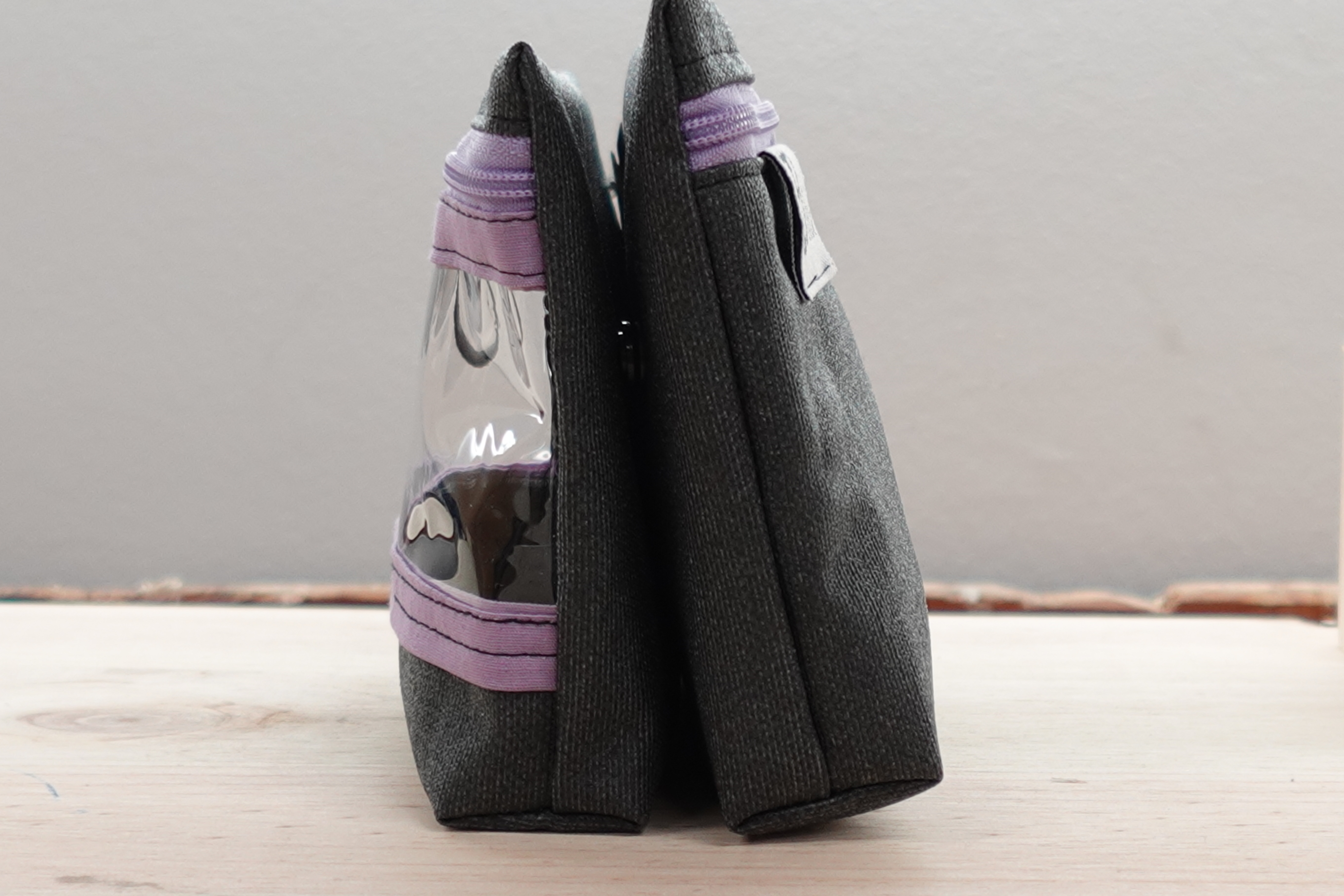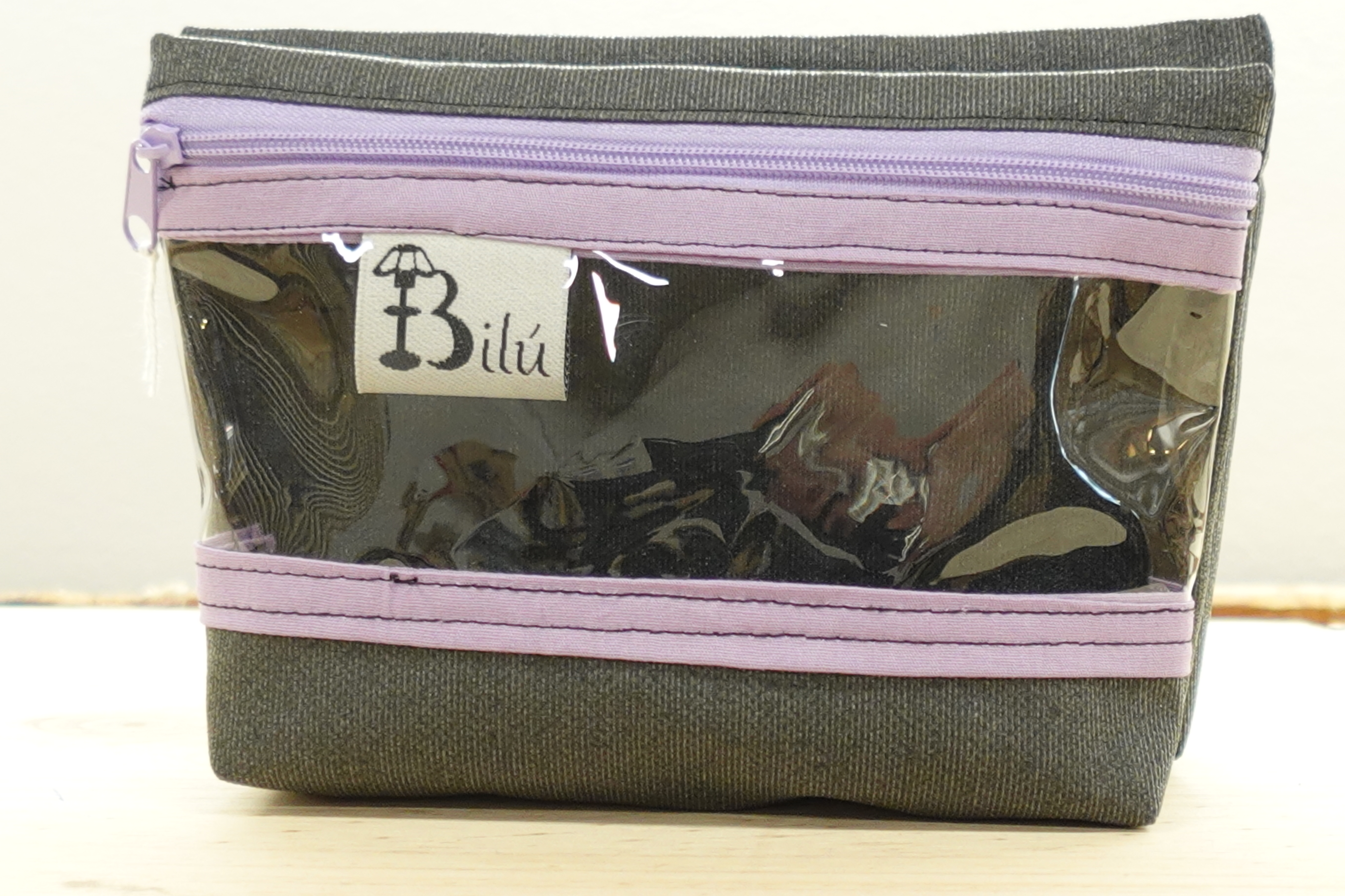 - El otro es de loneta resinada y lleva un visor transparente para que puedas ver lo que tienes dentro, el forro es resinado del mismo estampado y cierre de cremallera.
