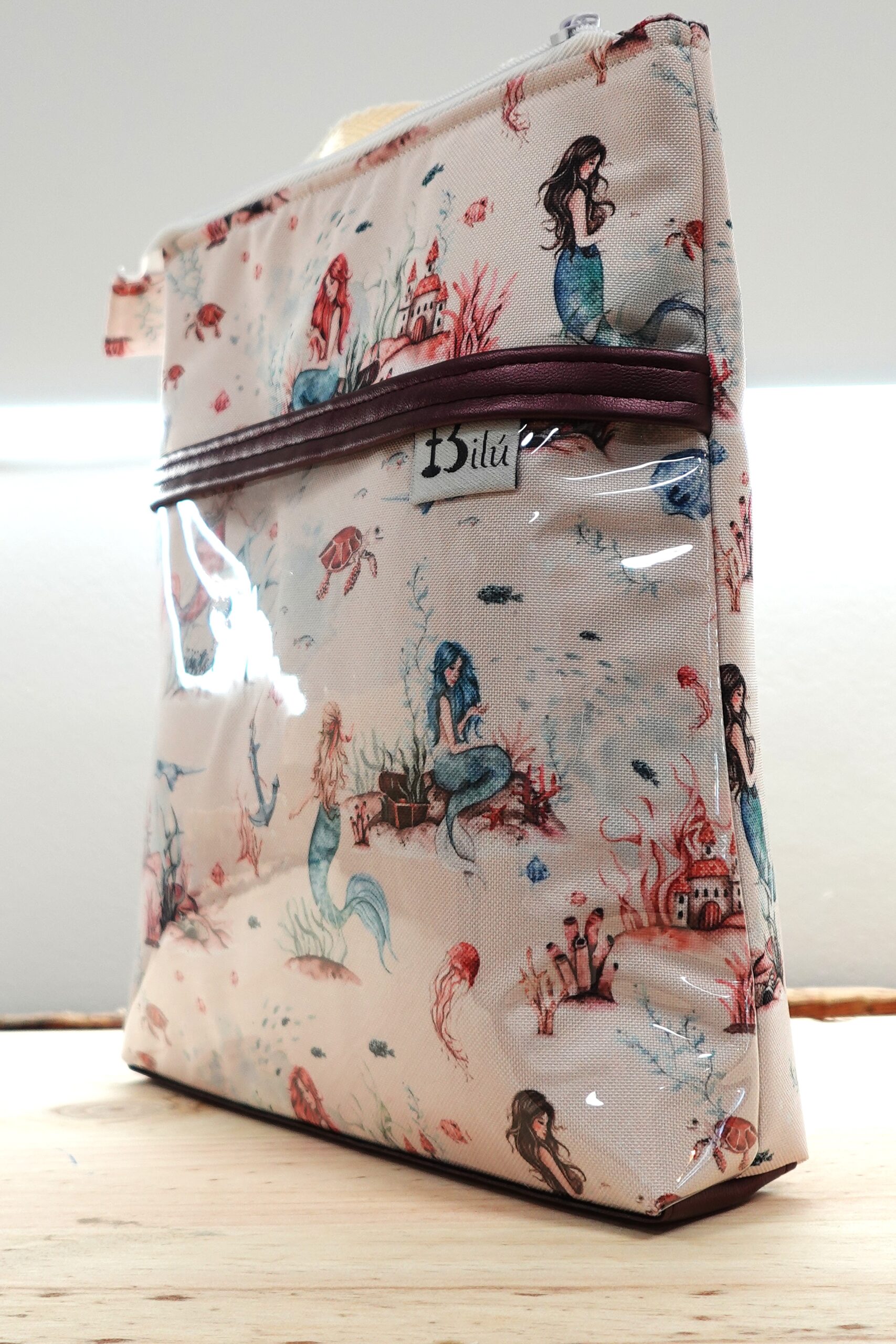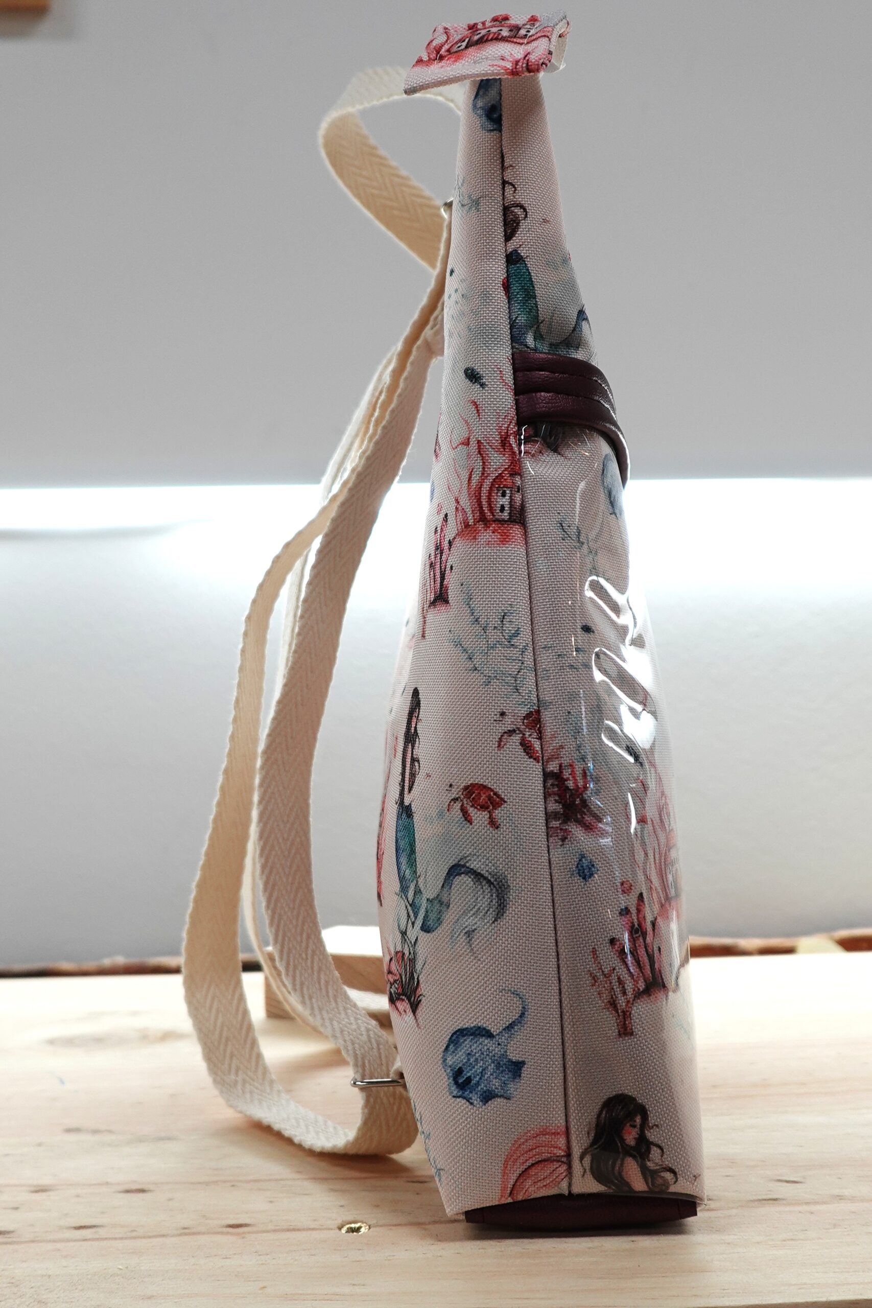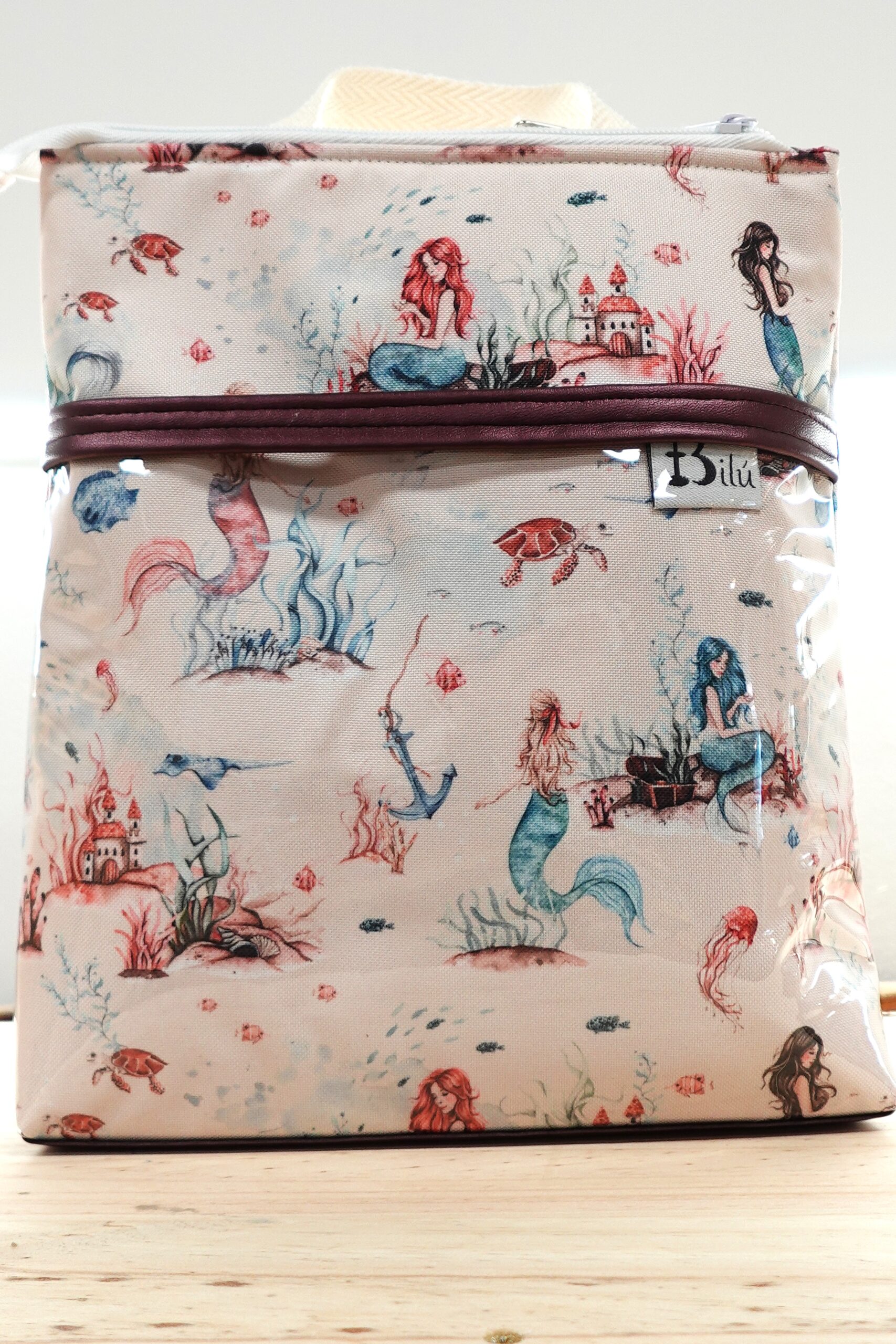 Mochila infantil de tela loneta resinada con motivos de sirenas en azul, con bolsillo delantero transparente con detalle en polipiel o tela resinada (depende del modelo). Forro de tela de algodón. Las correas son de algodón reciclado, suaves y resistentes. Base de polipiel para más resistencia.