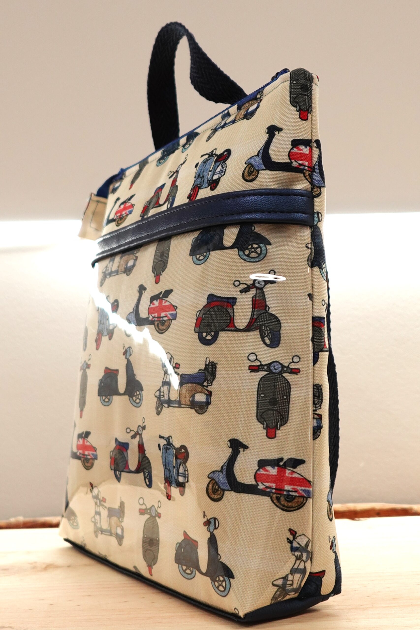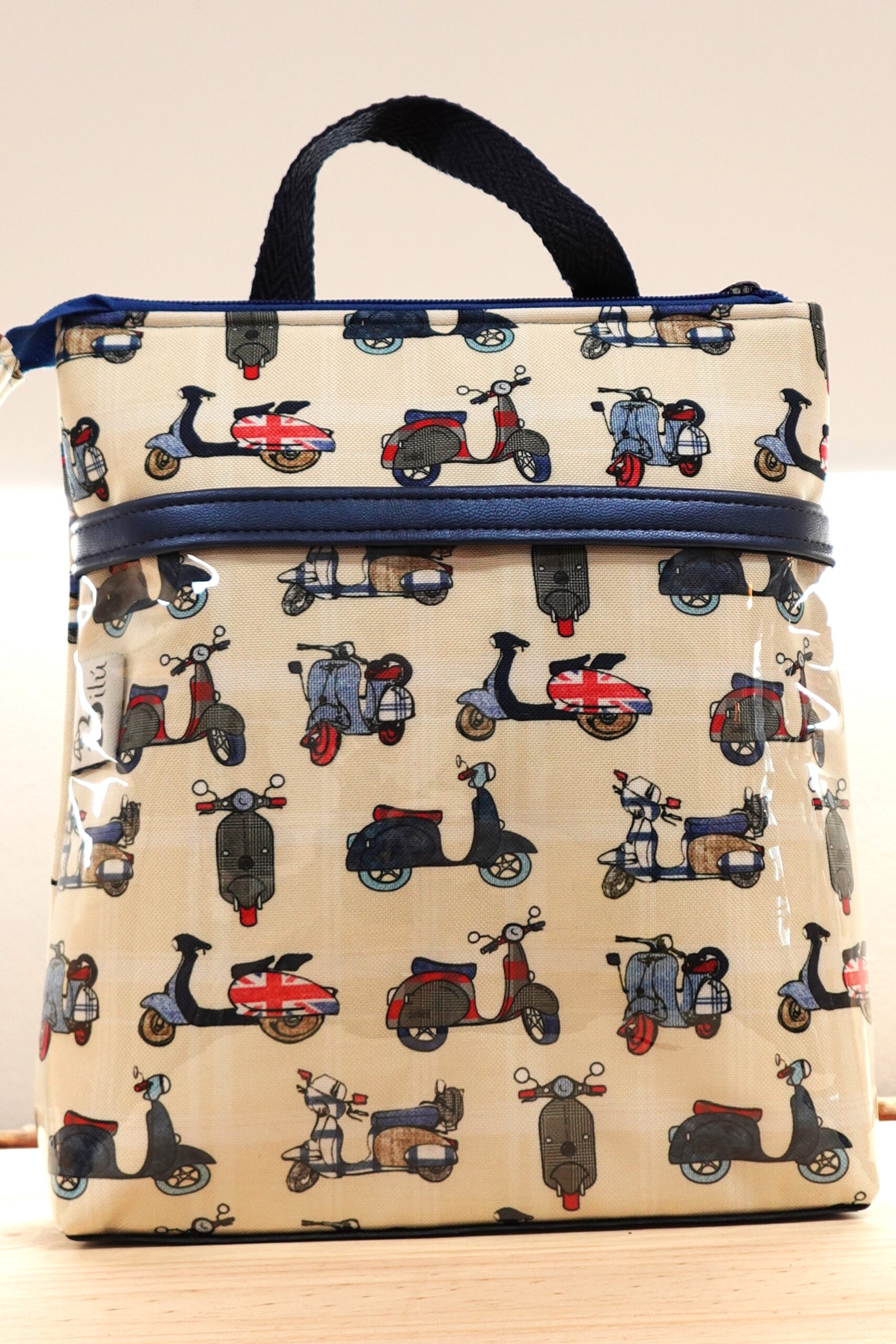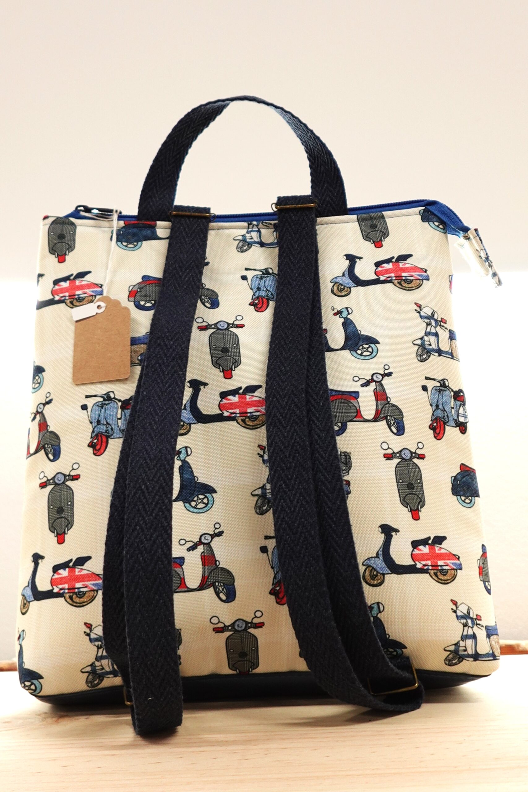 Mochila infantil de tela loneta resinada con motivos vespas clásicas, con bolsillo delantero transparente con detalle en polipiel o tela resinada (depende del modelo). Forro de tela de algodón. Las correas son de algodón reciclado, suaves y resistentes. Base de polipiel para más resistencia.