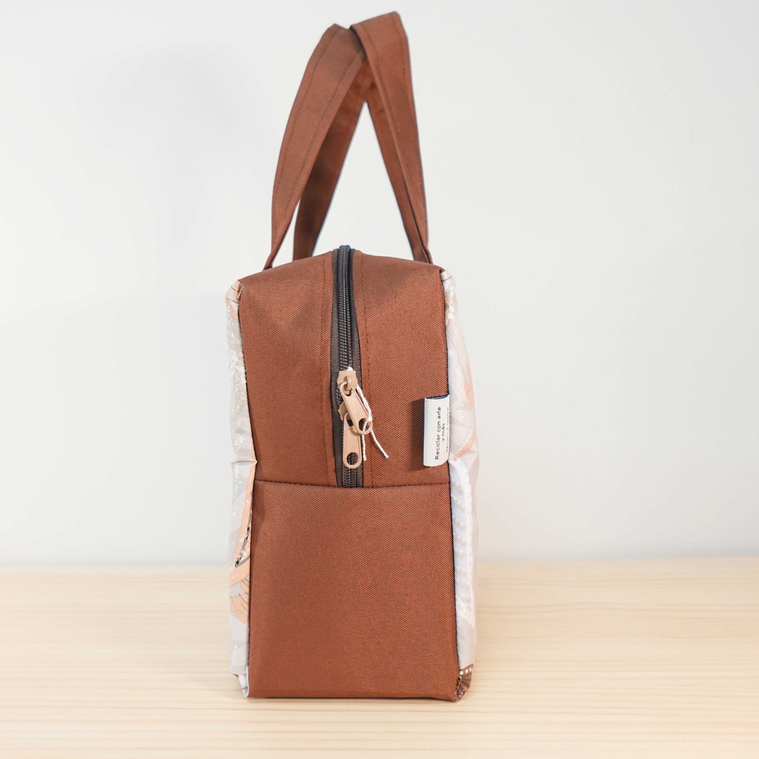 Lo serás con esta preciosa fiambrera de estampado en tonos marrón, crema y blanco roto con efecto brillo.