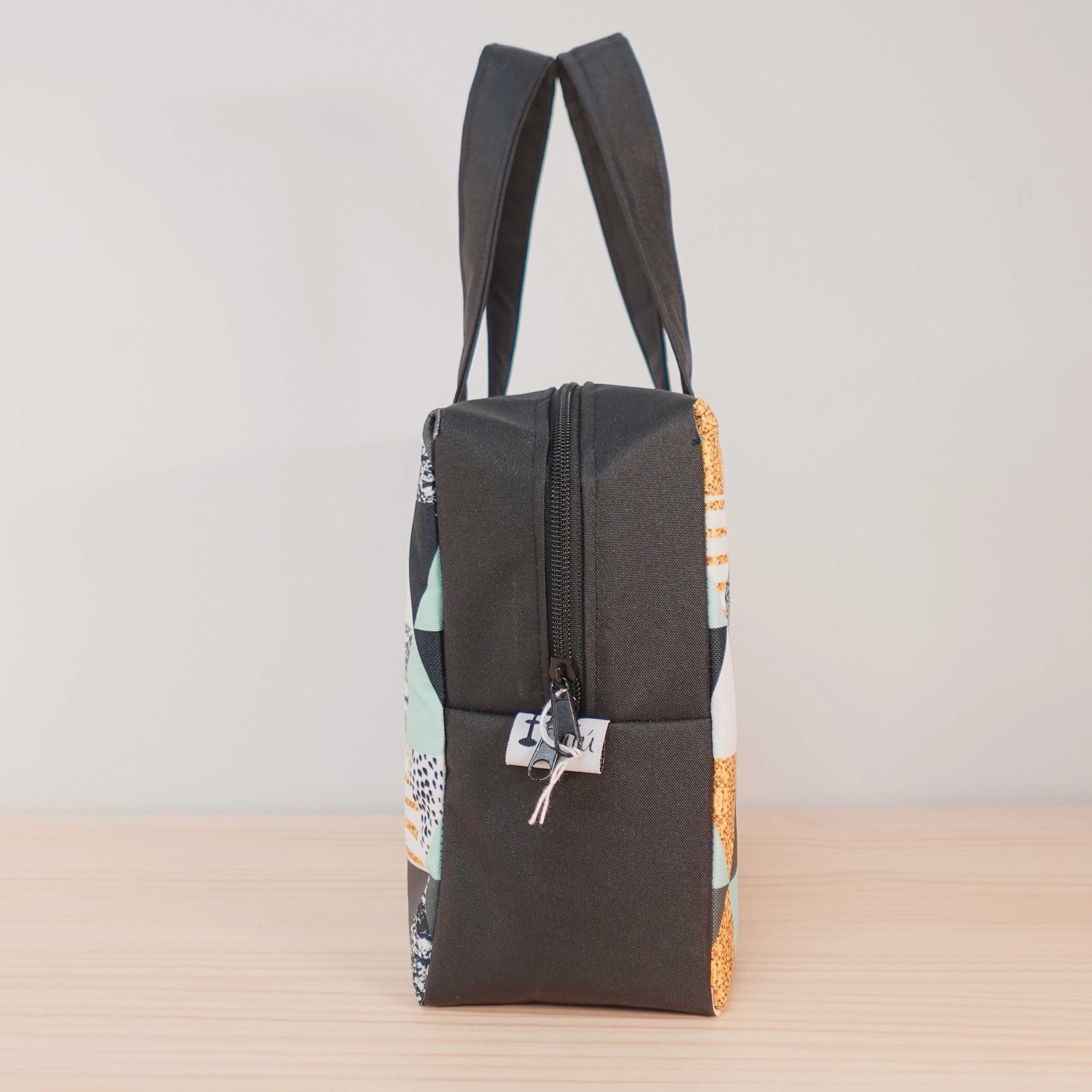 Lo serás con esta preciosa fiambrera de estampado con triángulos azules, dorados, negros…
